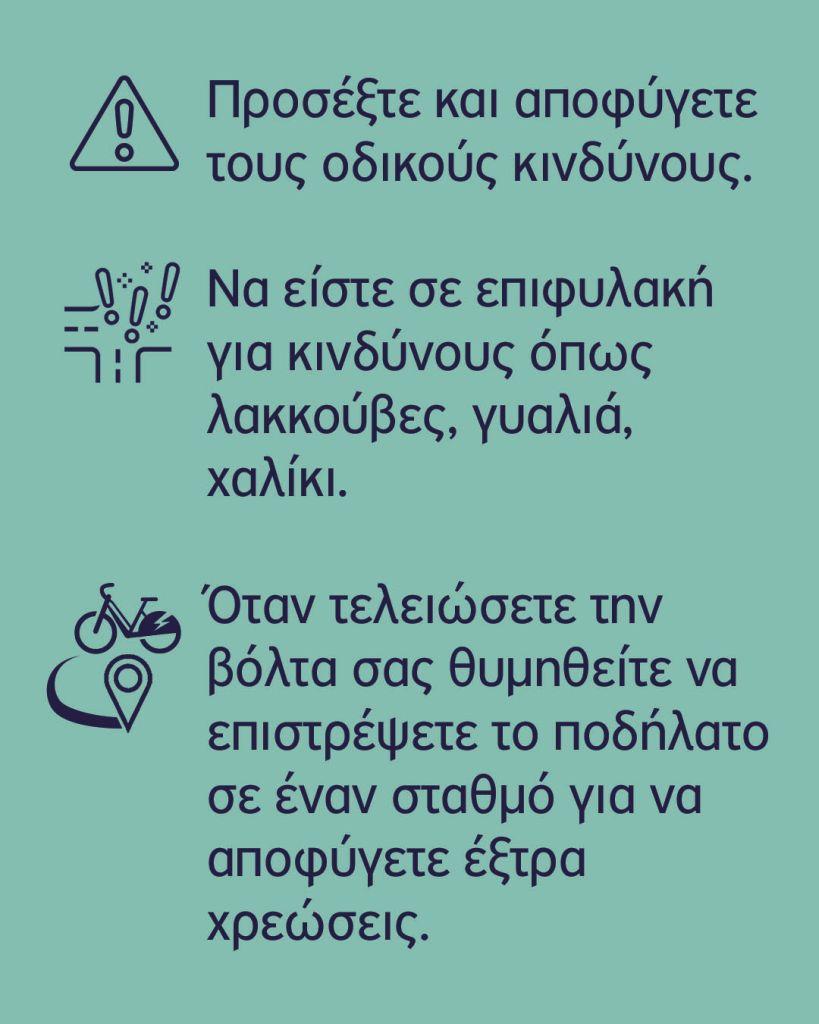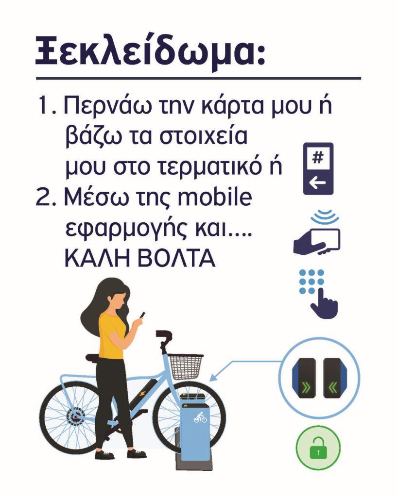 Ο χρήστης σαρώνει (scan) τον κωδικό QR που βρίσκεται στο ποδήλατο, αυτό ξεκλειδώνει και αρχίζει η χρήση του, το ανώτερο για τρεις ώρες. Επισημαίνουμε πως η χρήση της εφαρμογής είναι αυστηρά προσωπική.