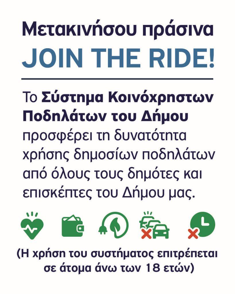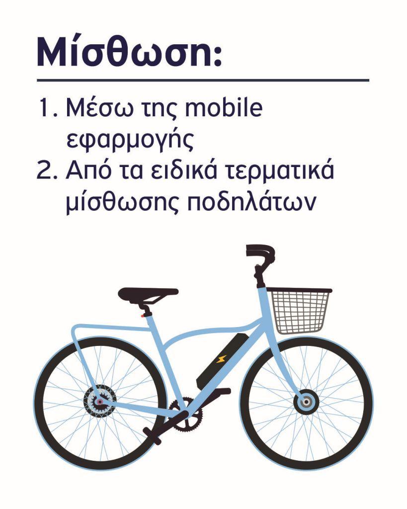 Κάθε πολίτης που επιθυμεί να χρησιμοποιήσει το Σύστημα Κοινόχρηστων Ποδηλάτων, θα πρέπει να κατεβάσει (δωρεάν από το «Play Store» και από το «App Store») την ειδική εφαρμογή της «e-bike sharing» και να κάνει εγγραφή. Δεν υπάρχει χρέωση για τη χρήση της υπηρεσίας και οι λειτουργίες του συστήματος παρέχονται δωρεάν.