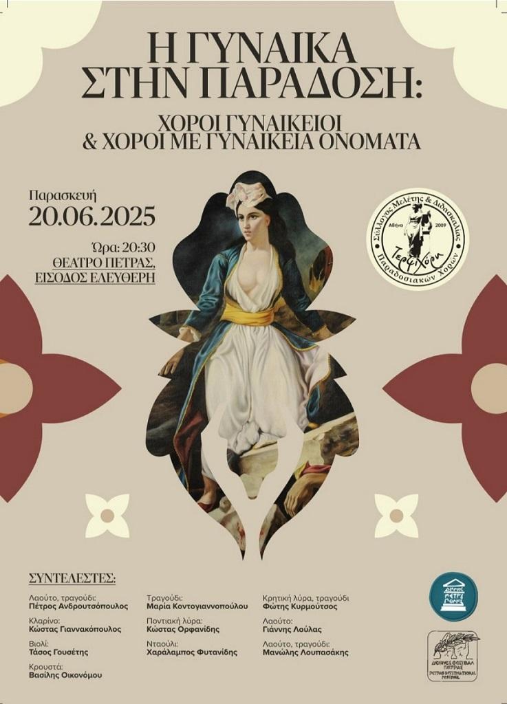 Το Σωματείο Μελέτης & Διδασκαλίας Παραδοσιακών Χορών «Τερψιχόρη» πραγματοποιεί σήμερα (20/6, 20:30), στη σκηνή του Θεάτρου Πέτρας «Μίνως Βολανάκης», εκδήλωση, με τίτλο: «Η γυναίκα στην παράδοση: χοροί γυναικείοι & χοροί με γυναικεία ονόματα».