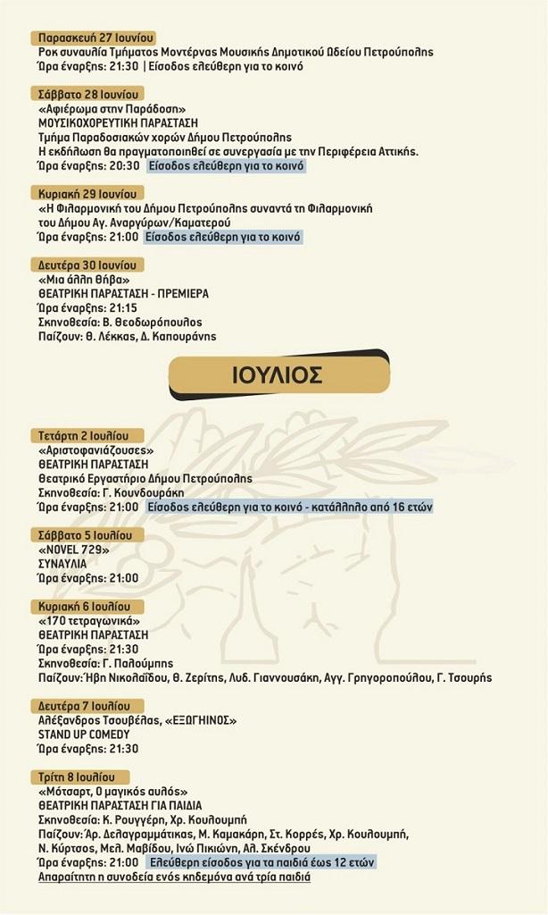 Συμμετέχουν: Φιλαρμονική Δήμου Πετρούπολης, θεατρική ομάδα 4ου Λυκείου, Τμήμα Σύγχρονου Τραγουδιού Δημοτικού Ωδείου Πετρούπολης και μουσικό σύνολο 3ουΛυκείου.