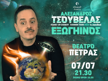 Τη Δευτέρα 7 Ιουλίου 2025, στις 21:30, ο Αλέξανδρος Τσουβέλας… προσγειώνεται στη σκηνή «Μίνως Βολανάκης» του θεάτρου Πέτρας, για την παράσταση: «ΕΞΩΓΗΙΝΟΣ».
