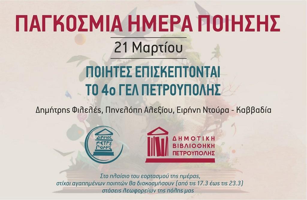 Στο πλαίσιο του εορτασμού της Παγκόσμιας Ημέρας Ποίησης, στις 21 Μαρτίου, σε συνέχεια της περσινής καινοτόμου δράσης, φέτος θα επισκεφτούν το 4ο Λύκειο οι ποιητές/ποιήτριες: Δημήτρης Φιλελές, Πηνελόπη Αλεξίου, Ειρήνη Ντούρα-Καββαδία.