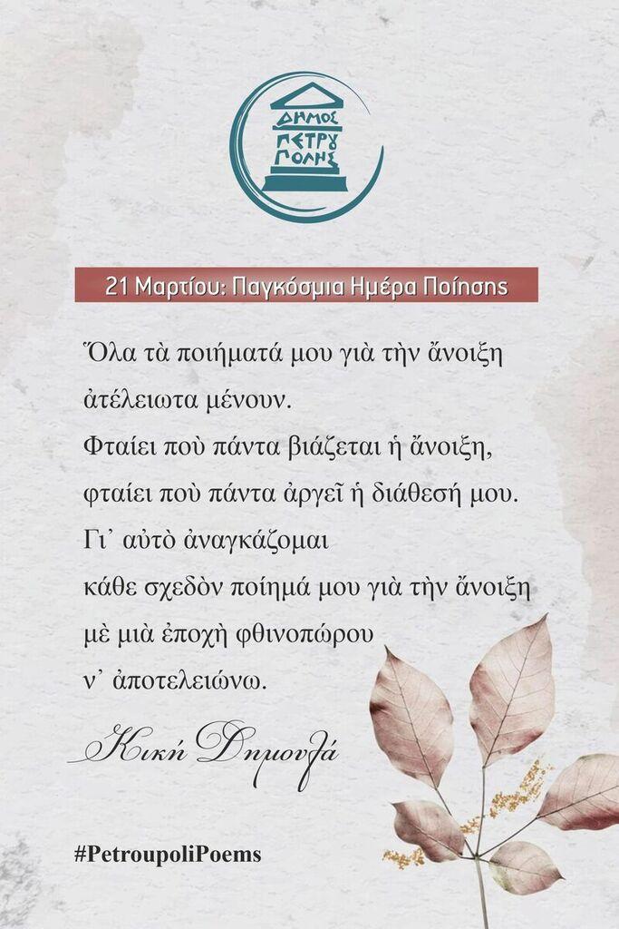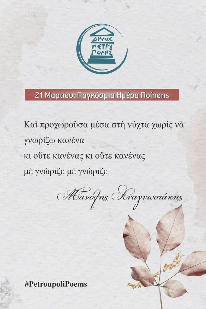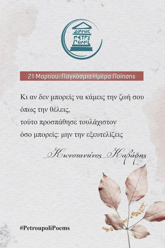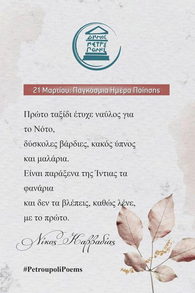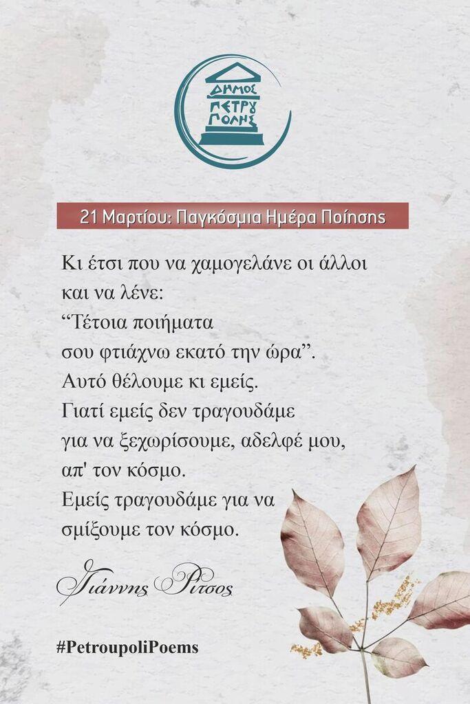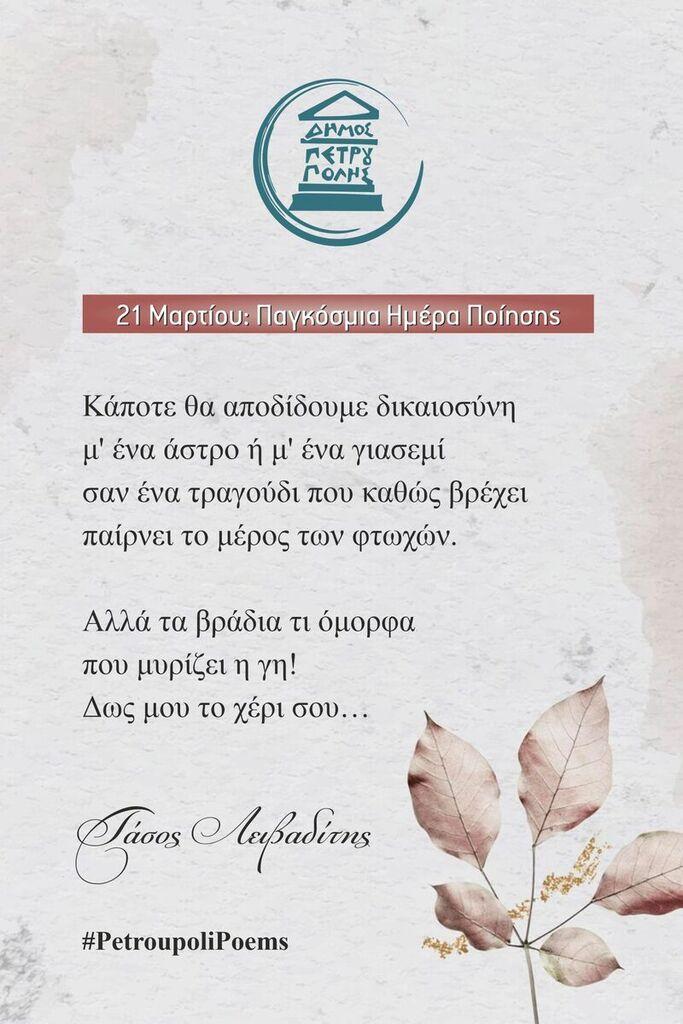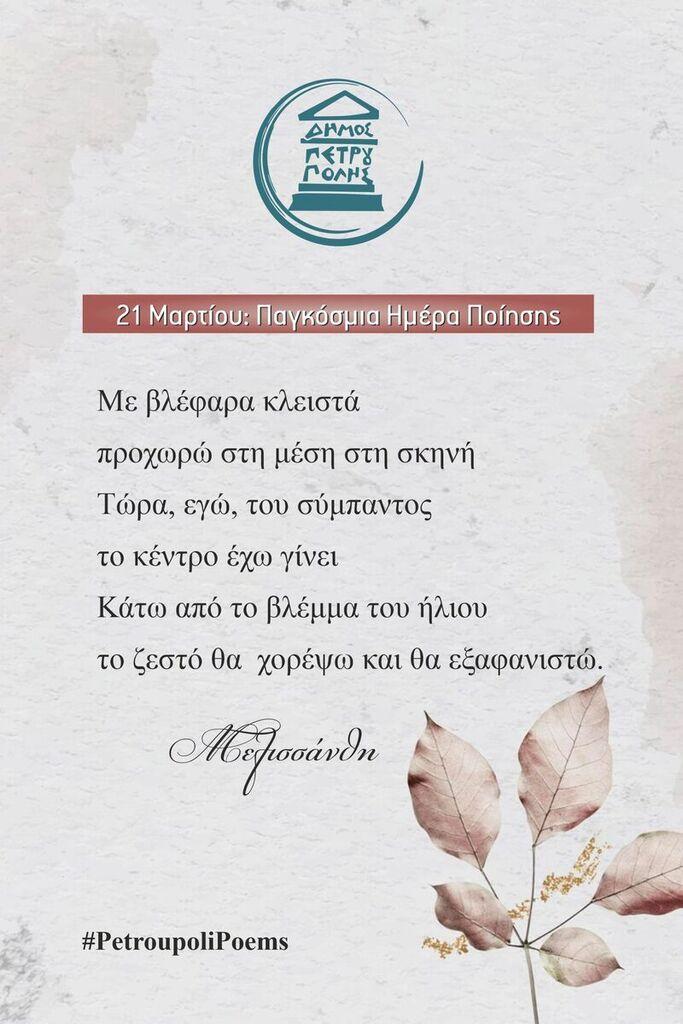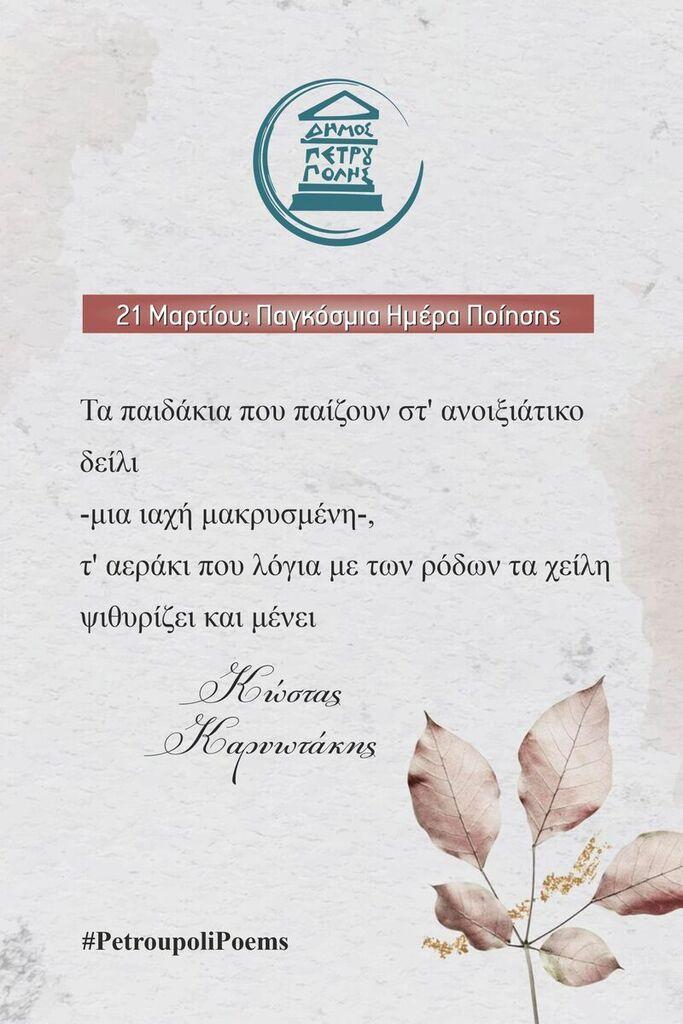 Επίσης, ήδη στίχοι αγαπημένων Ελλήνων ποιητών κοσμούν (από τις 17 έως τις 23 Μαρτίου) δεκαέξι προθήκες στις στάσεις λεωφορείων της πόλης μας.