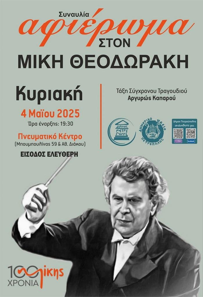 Το Δημοτικό Ωδείο Πετρούπολης και ειδικότερα η τάξη Σύγχρονου Τραγουδιού, υπό την ευθύνη και διδασκαλία της Αργυρώς Καπαρού, πραγματοποιεί αφιερωματική συναυλία στο εμβληματικό έργο του Μίκη Θεοδωράκη, η οποία θα γίνει την Κυριακή 4 Μαΐου στις 19:30 στο Πνευματικό Κέντρο.