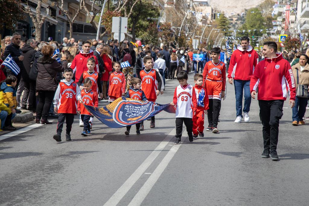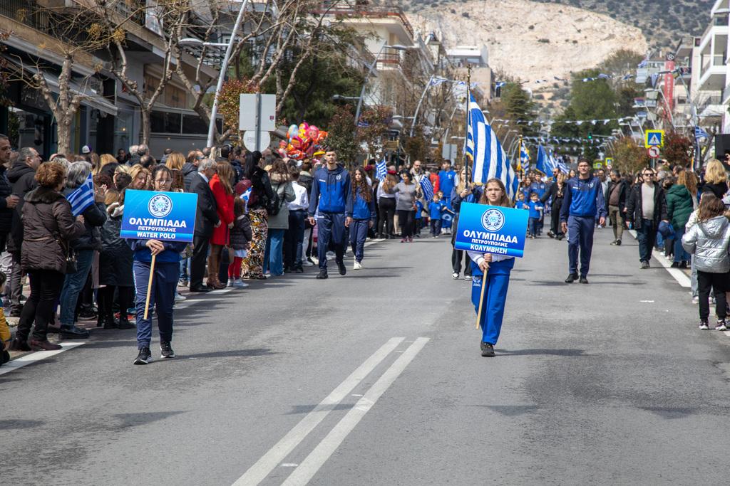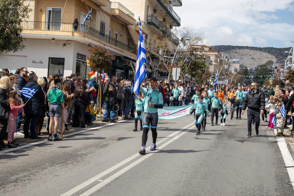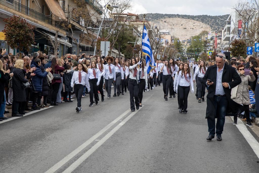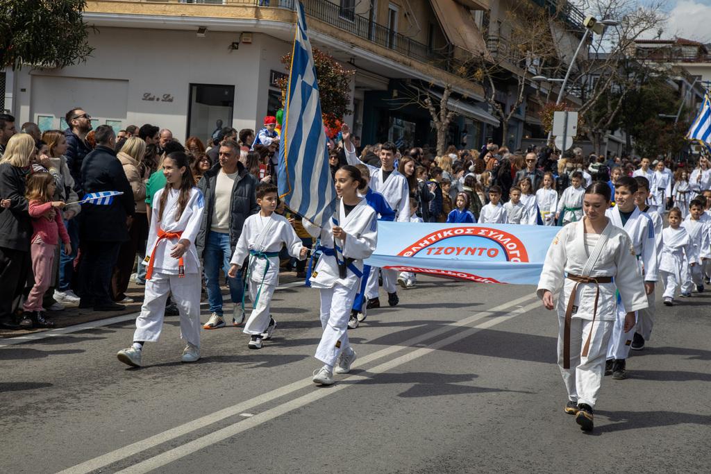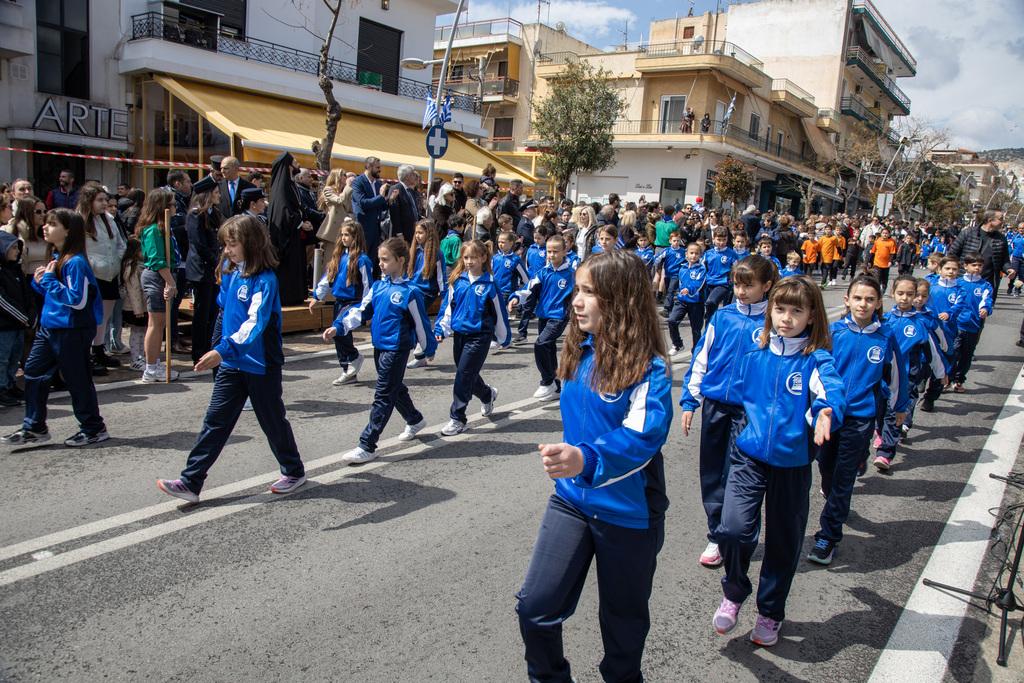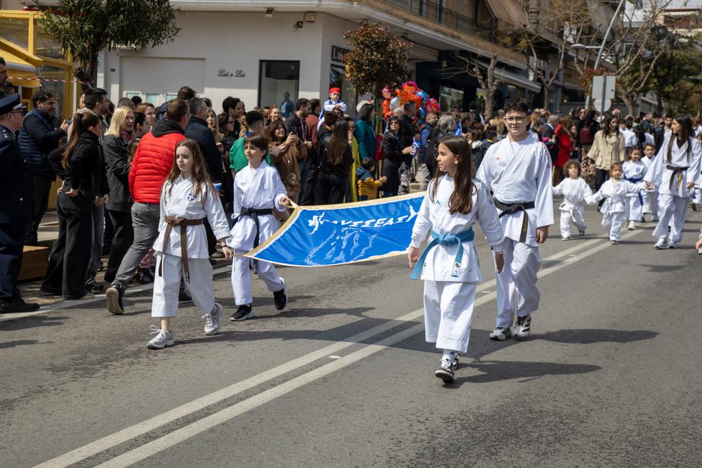 Στη συνέχεια ξεκίνησε η παρέλαση μαθητών και μαθητριών, μελών από τα δημοτικά τμήματα Πολιτισμού και Αθλητισμού, τους Εθνικοτοπικούς-Πολιτιστικούς Συλλόγους και τα Αθλητικά Σωματεία της πόλης μας.