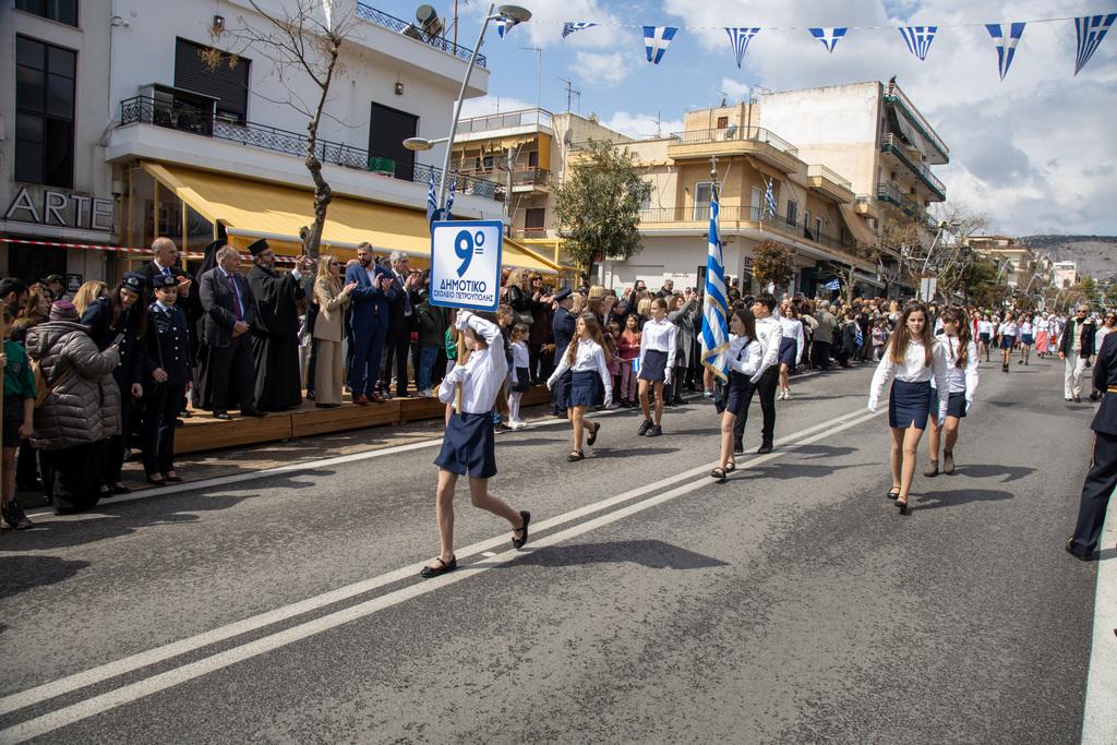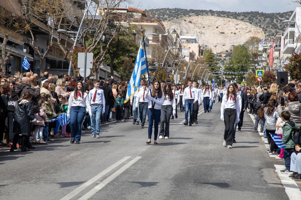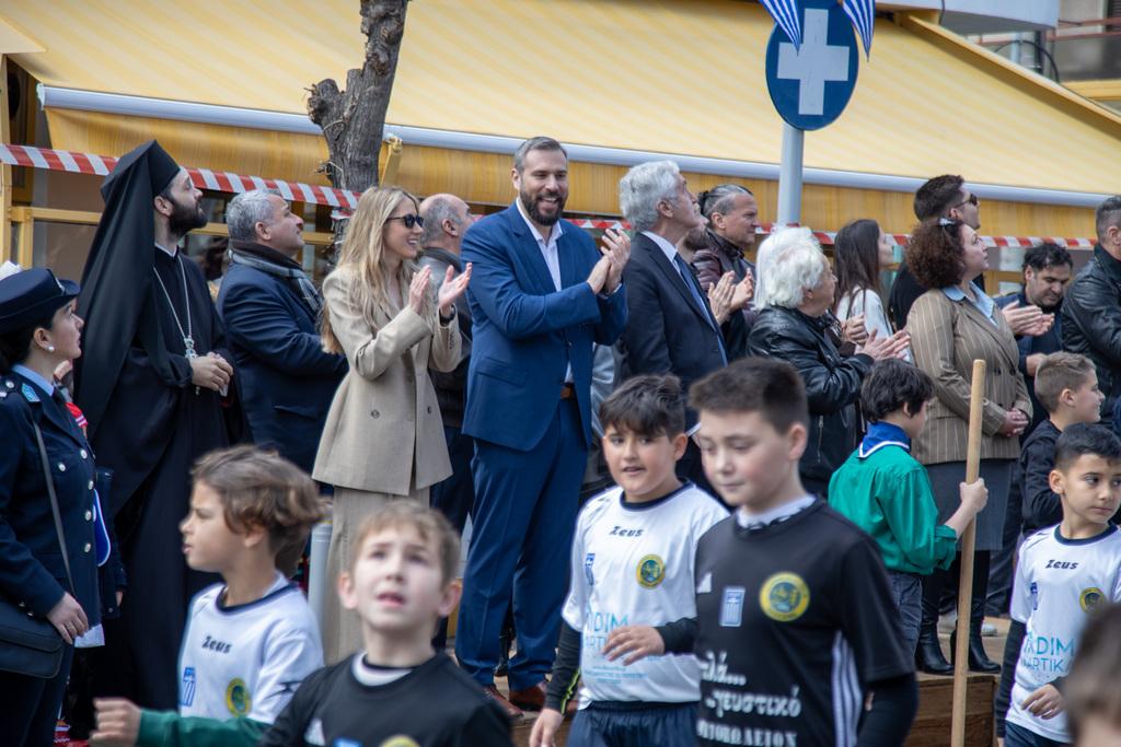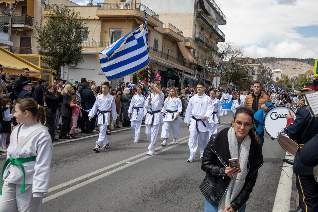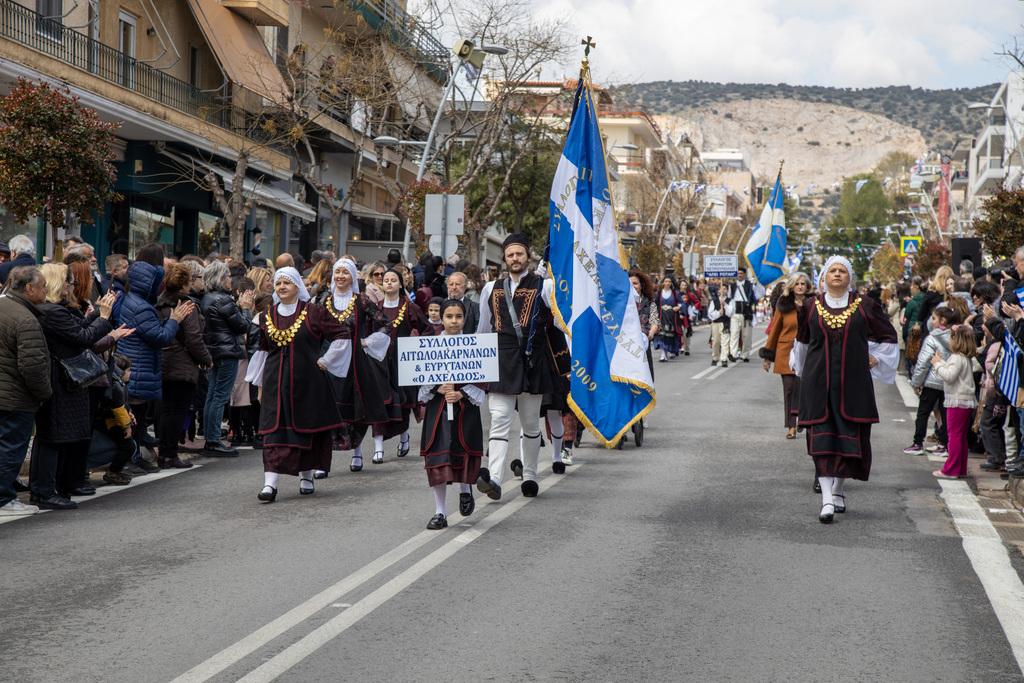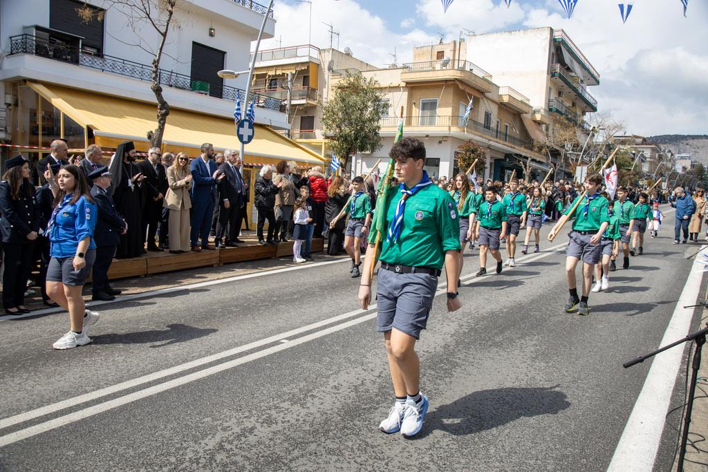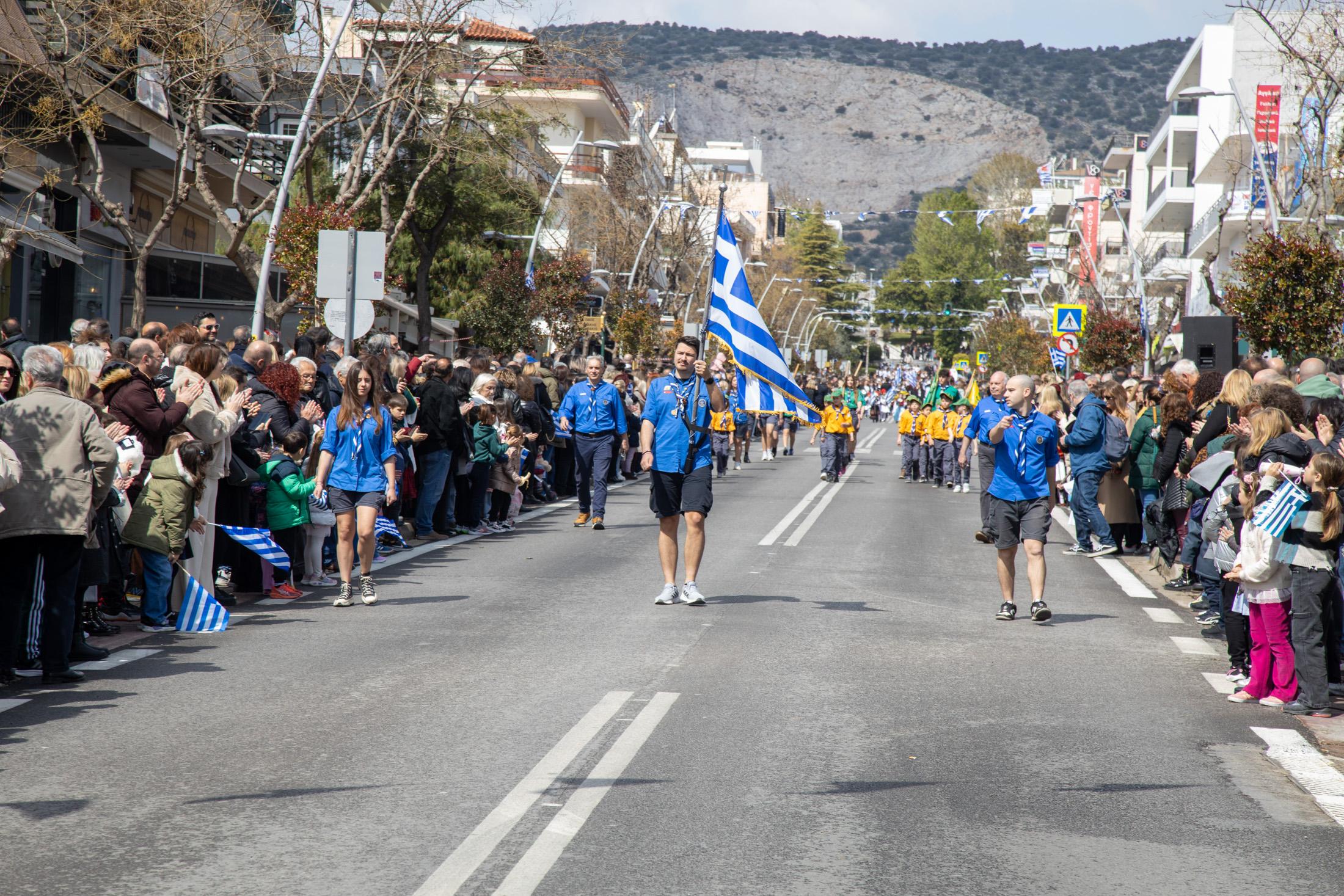 Στη συνέχεια ξεκίνησε η παρέλαση μαθητών και μαθητριών, μελών από τα δημοτικά τμήματα Πολιτισμού και Αθλητισμού, τους Εθνικοτοπικούς-Πολιτιστικούς Συλλόγους και τα Αθλητικά Σωματεία της πόλης μας.