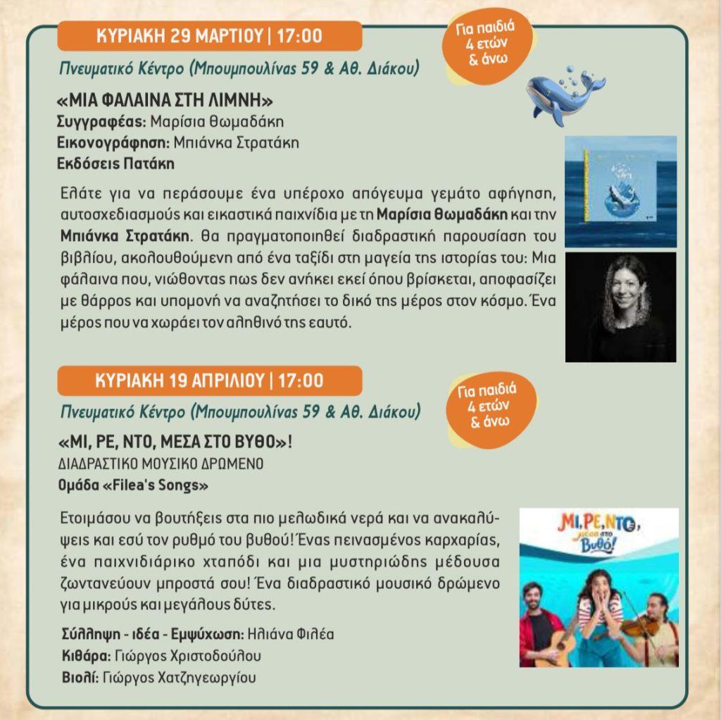 Η δράση υλοποιείται σε συνεργασία με τη Δημοτική Βιβλιοθήκη και τα βιβλιοπωλεία της πόλης «Αναζήτηση», «Γνώση» και «Pickabook», στο Πνευματικό Κέντρο του Δήμου (Μπουμπουλίνας 59 & Αθ. Διάκου), με ελεύθερη είσοδο.