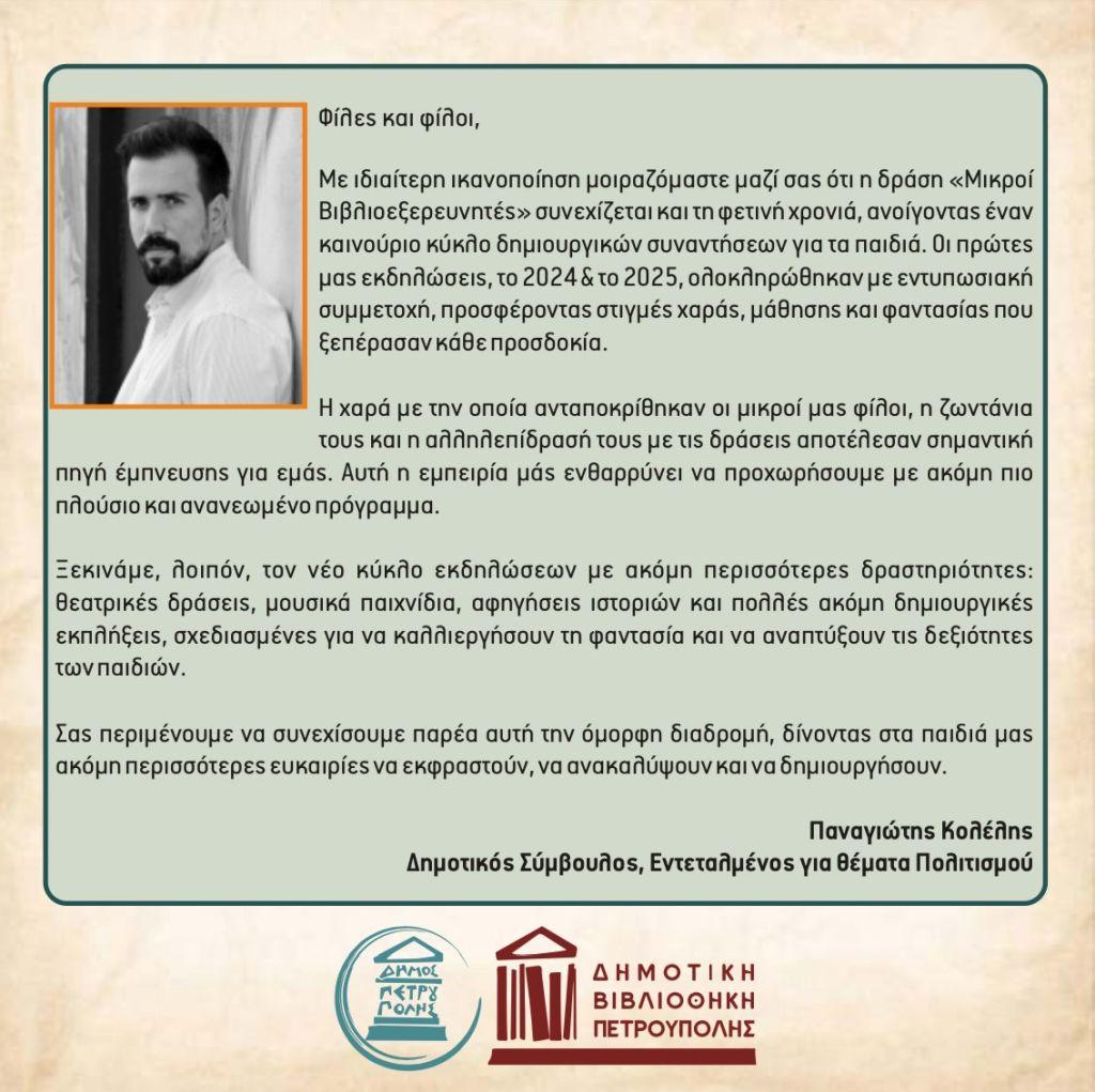 Παιδιά και όσοι ενήλικες νιώθετε παιδιά, σας έχουμε ευχάριστα νέα. Οι «Μικροί Βιβλιοεξερευνητές», η δράση του Δήμου Πετρούπολης που «αγκαλιάσατε» με τόση θέρμη, θα συνεχιστεί και το 2026.