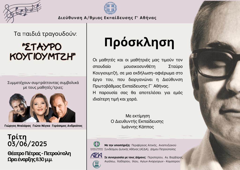 Ο Γιώργος Νταλάρας συμπράττει με τους μαθητές και τις μαθήτριες στη σημερινή (3/6, 20:30) αφιερωματική συναυλία της Διεύθυνσης Πρωτοβάθμιας Εκπαίδευσης Γ’ Αθήνας, «Τα παιδιά τραγουδούν: “Σταύρο Κουγιουμτζή”», με την οποία «ανοίγει η αυλαία» του «Διεθνούς Φεστιβάλ Πέτρας».
