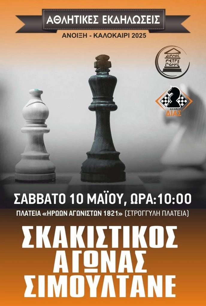 Ο Δήμος, σε συνεργασία με τον Αναγεννησιακό Σκακιστικό Όμιλο Πετρούπολης «ΔΙΑΣ», διοργανώνει -στο πλαίσιο των «Αθλητικών Εκδηλώσεων 2025»- το Σάββατο 10 Μαΐου στις 10:00 στην πλατεία «Ηρώων Αγωνιστών 1821» (στρογγυλή πλατεία), αγώνα Σιμουλτανέ, όπου ένας έμπειρος σκακιστής διαγωνίζεται εναντίον πολλών αντιπάλων.