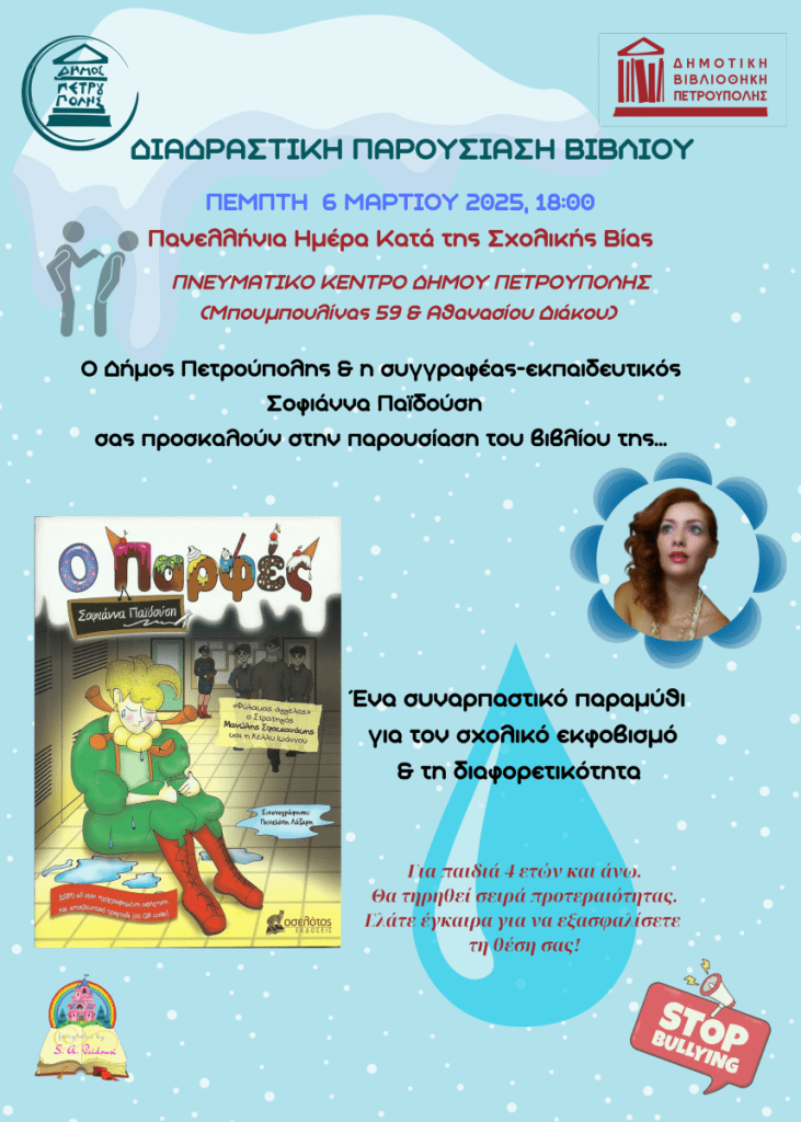 Ο Δήμος Πετρούπολης και η συγγραφέας-εκπαιδευτικός, Σοφιάννα Παϊδούση, σας προσκαλούν -με αφορμή την Πανελλήνια Σχολική Ημέρα κατά της Βίας- στην παρουσίαση του βιβλίου, για παιδιά από 4 χρονών, «Ο Παρφές».